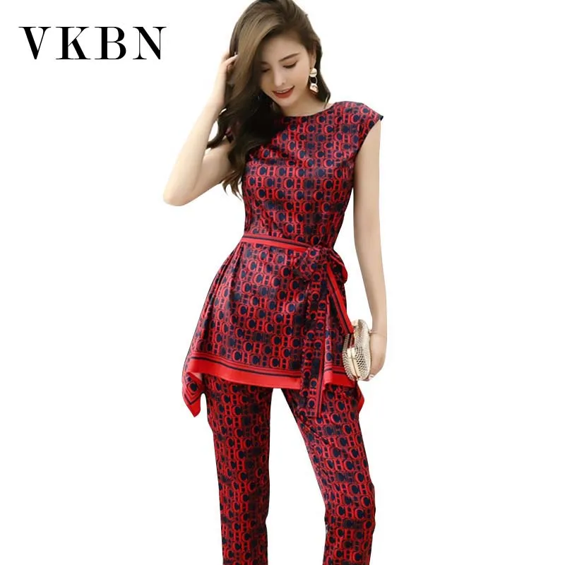 VKBN Irregular Top 2 Piece Set Women Letter Print Sleeveless High Waist Straight Trousers Suit O-Neck Pullover Pants Set